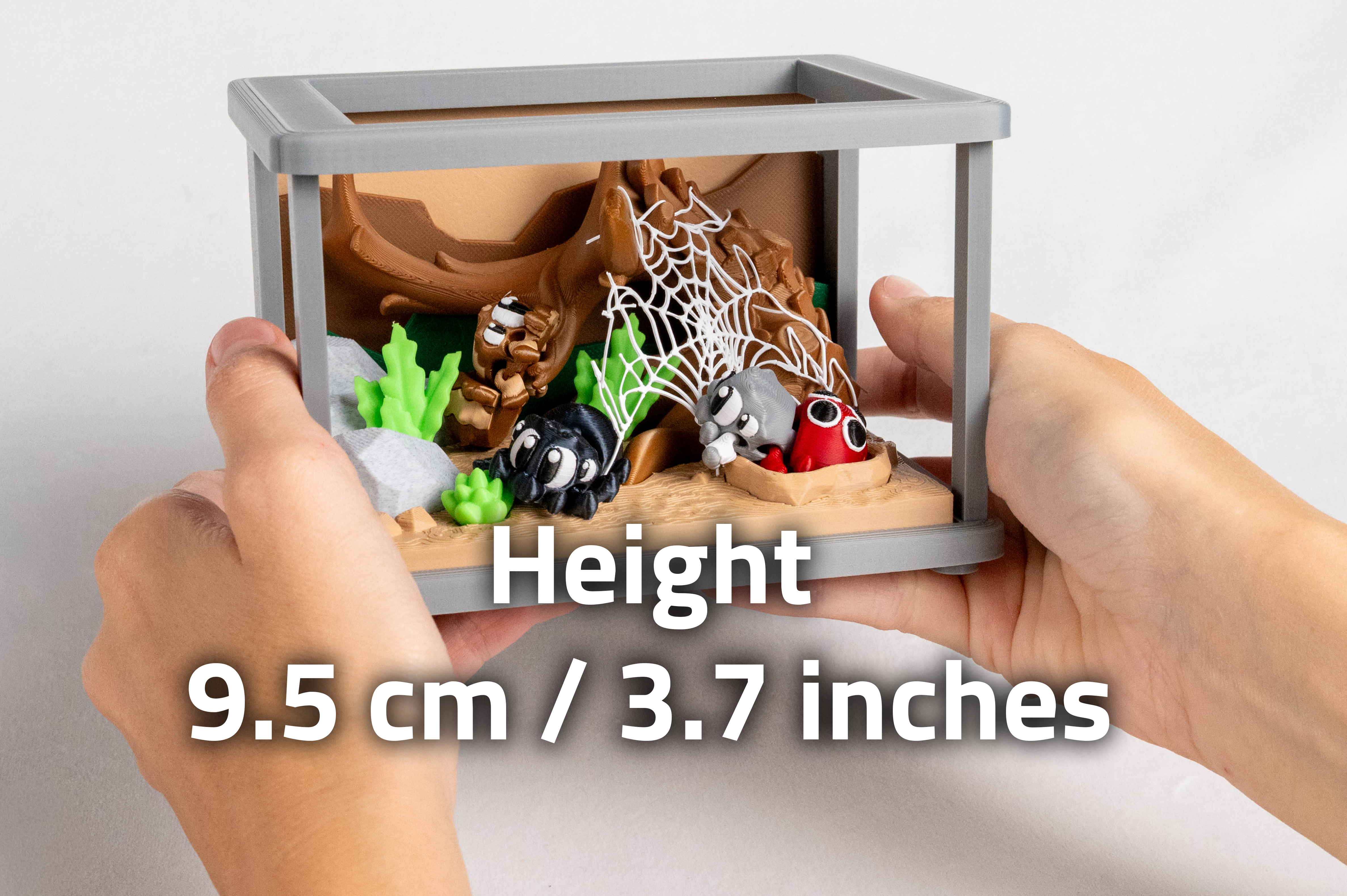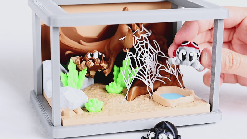 Inside the 3D Printed Spider Enclosure, three unique articulated spiders explore their delicate web. Each spider moves at the body and legs, perfect for fidgeting or posing, and can be hung by a thread through a tiny hole at the back. This collectible 3D printed Fiddly Home arrives fully assembled and ready to display, making it a perfect choice for anyone who loves spiders, fidget toys, or eerie little creations.